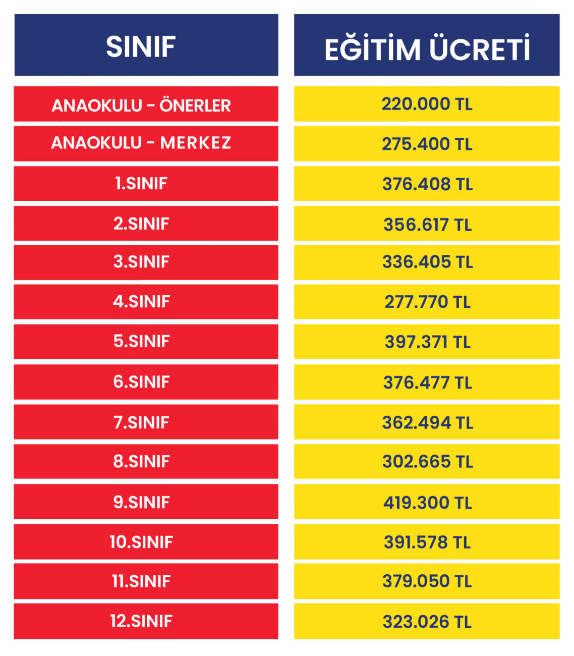 2026-2027 eğitim öğretim yılına ait eğitim ücretleri aşağıda yer almaktadır. Bu rakamlar, KDV dahil peşin fiyatlardır, taksitli ödemelerde vade farkı uygulanır. Yemek ve servis ücretleri ile MEB mevzuatı gereği uygulanan genel giderler eğitim ücretine dahil değildir.